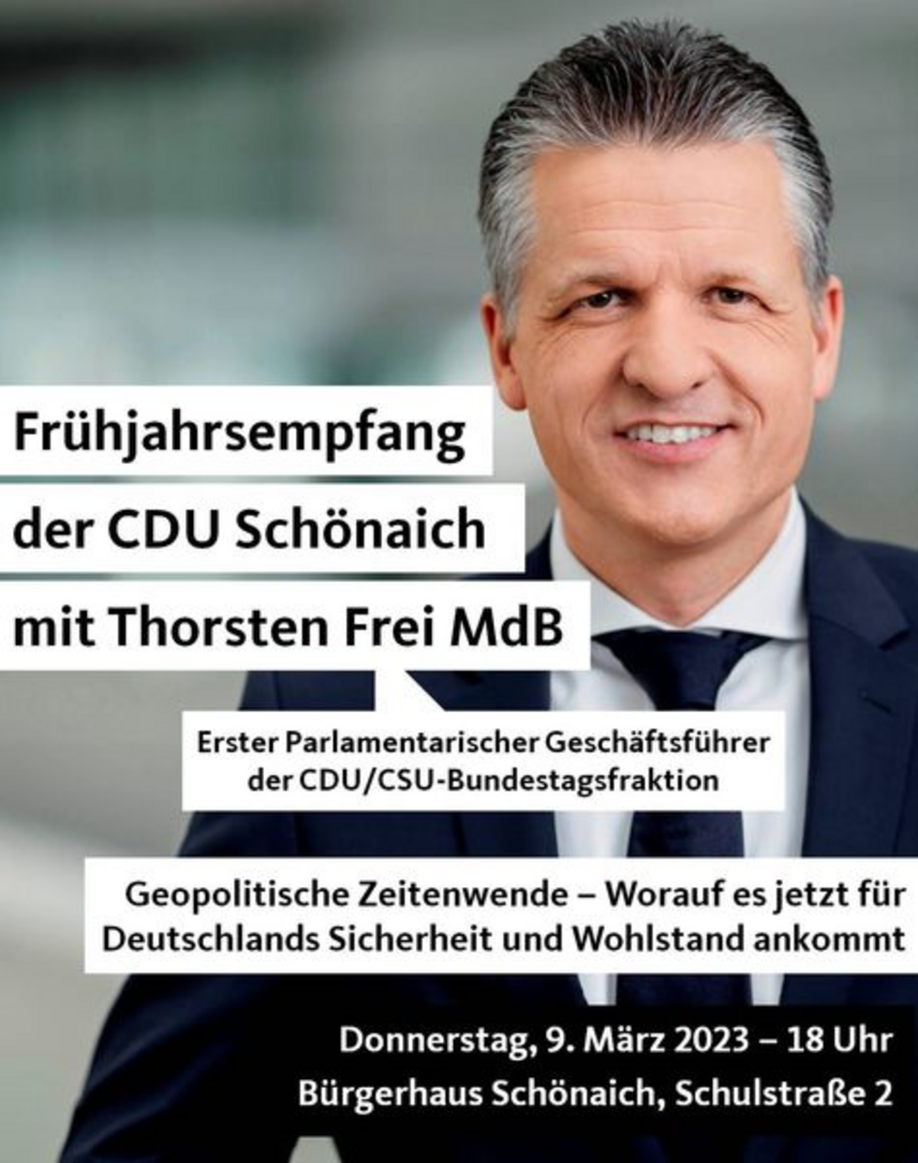 Der Frühjahrsempfang des CDU-Gemeindeverbands findet am Donnerstag, den 9. März 2023, um 18.00 Uhr, mit dem Bundestagsabgeordneten Thorsten Frei im Bürgersaal des Bürgerhauses (Schulstraße 2) in Schönaich statt. Die Veranstaltung wird von einem Ensemble des Musikvereins musikalisch umrahmt. Grußworte werden die beiden Abgeordneten Marc Biadacz und Dr. Matthias Miller sprechen. Im Anschluss an die Veranstaltung besteht die Möglichkeit für Gespräche und Begegnungen. Gäste sind herzlich Willkommen! Für den CDU-Gemeindeverband Schönaich Markus Mezger