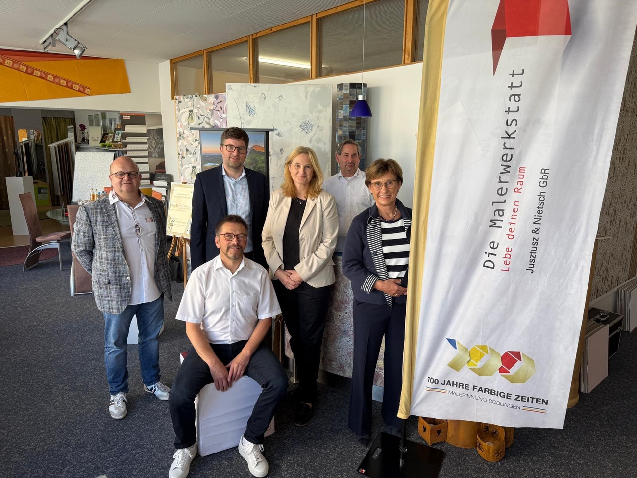 Sabine Kurtz MdL besuchte gemeinsam mit den CDU-Landtagskandidaten Regina Dvořák-Vučetić und Albrecht Stickel die Malerwerkstatt Jusztusz & Nietsch GbR in Aidlingen. Eingeladen hatte Kreishandwerksmeister Hartmut Nietsch, der gemeinsam mit Hans-Joachim Jusztusz seit vielen Jahren erfolgreich im Landkreis tätig ist. Im Mittelpunkt des Besuchs stand der Austausch mit Thomas Wagner, Geschäftsführer der Kreishandwerkerschaft Böblingen, zur aktuellen Lage des Handwerks in der Region.