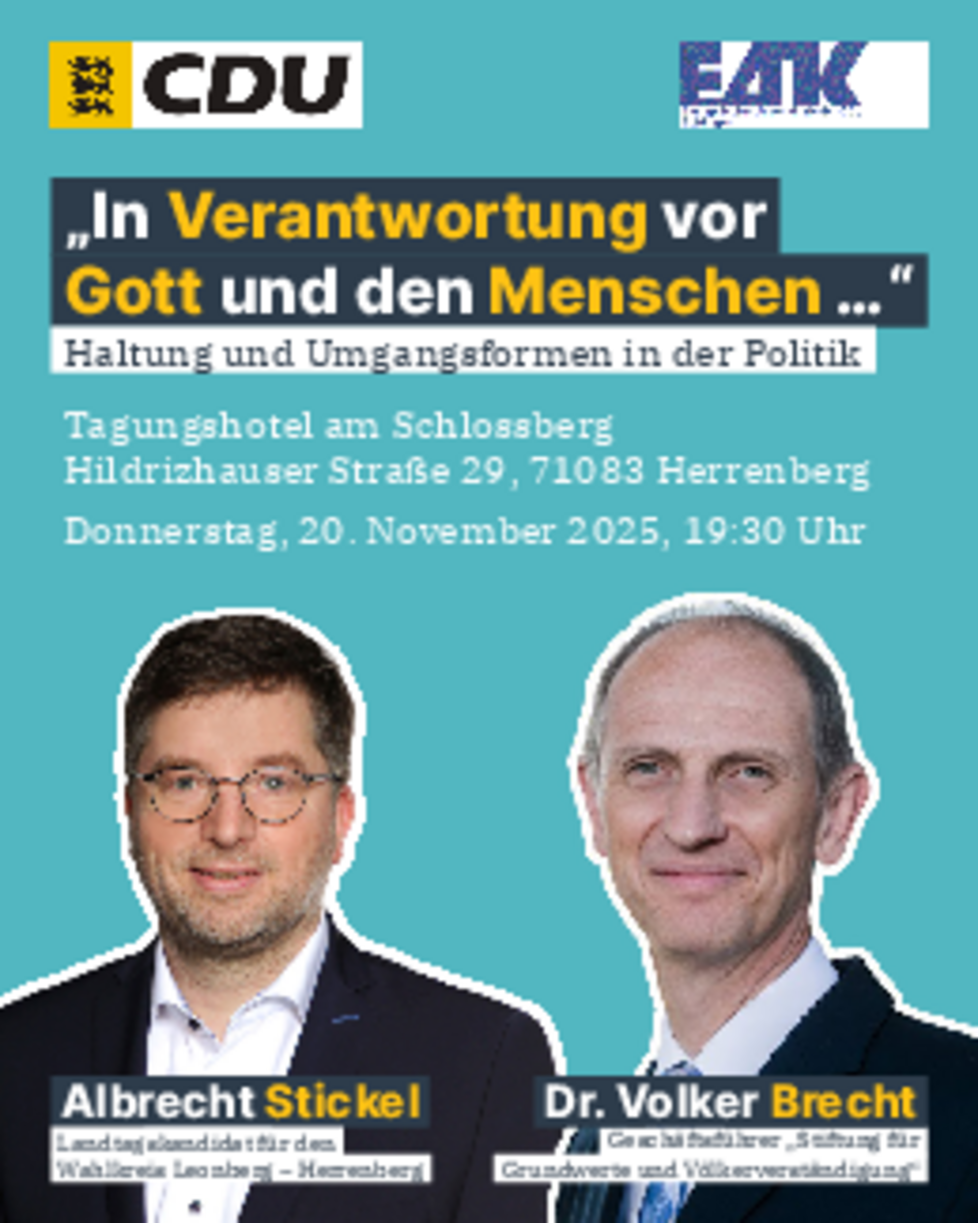 wir laden euch herzlich zu einer besonderen Abendveranstaltung ein, die von der CDU Baden-Württemberg gemeinsam mit dem Evangelischen Arbeitskreis (EAK) der CDU Böblingen ausgerichtet wird: